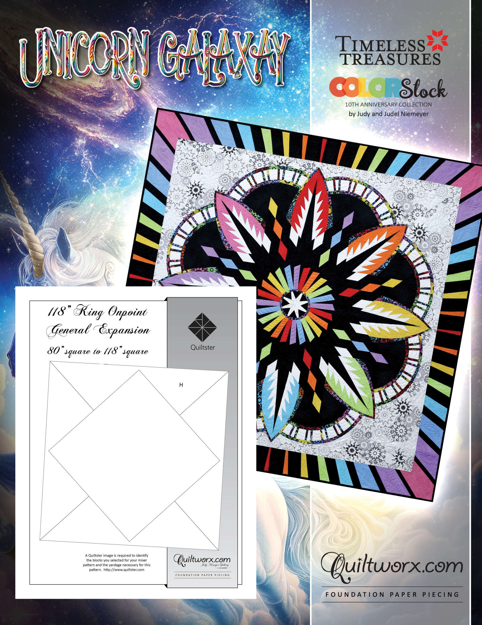 Unicorn Galaxy is a foundation paper pieced pattern by Quiltworx.com. This layout can be used to turn the existing pattern into a Queen Size design measuring 118" square. Open the project, then add your King Expansion border of your choice to the project. To purchase, you will need to buy the original Unicorn Galaxy pattern and whichever 277-H border you choose.