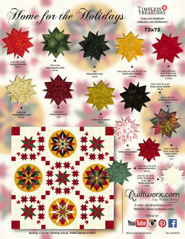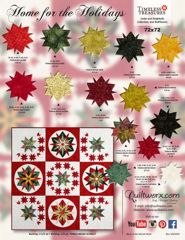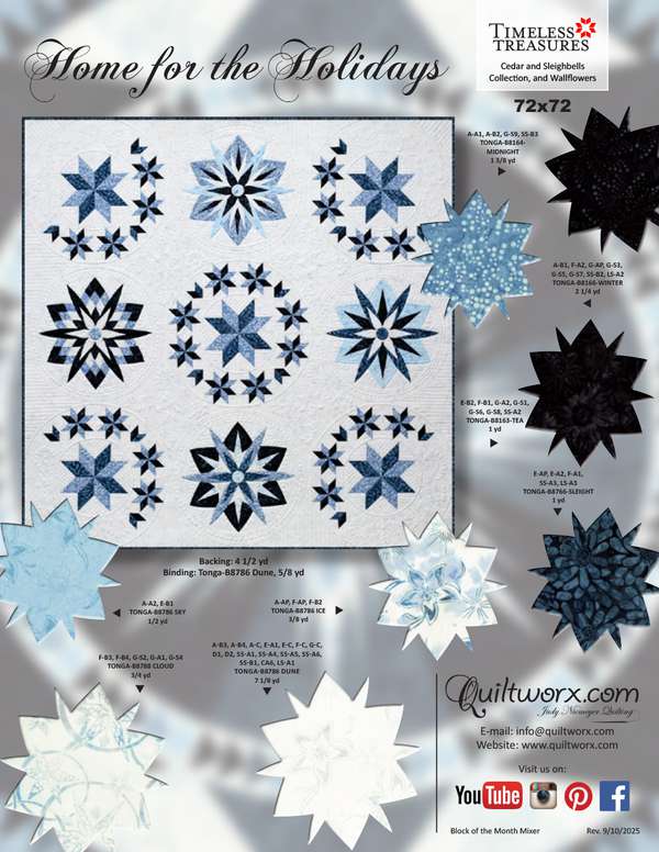 Get ready to deck the halls with our charming new pattern, Home for the Holidays! This delightful design features an enchanting arrangement of snowflake blocks and stars that come together in a beautiful wreath effect, perfect for adding that festive touch to your home. Crafted from the versatile Cedar and Sleighbells Collection by Judy and Judel from Timeless Treasures, this pattern is available in three stunning colorways—each one a celebration of warmth or cool elegance. The cover quilt showcases exquisite edge-to-edge quilting, with the blue and white version lovingly quilted by Louise Klare. Need more room for holiday cheer? No problem! You can expand your quilt effortlessly by purchasing two sets of Replacement Papers, allowing you to create a generous 120″ square masterpiece. Alternatively, grab one of our Adjustable Border Packages to grow your 72″ quilt into a cozy 94″ square. You’ll pick the design of your choice, and make the 80″ border option and trim down the blocks in the middle to the width necessary for the 72″ pattern. All of these options are listed under the Buy Now button. And don’t forget about our wide selection of essential tools—rulers, glue sticks, basting glues, purple thangs, and more—all designed to make your paper piecing, block assembly, and appliquéing as easy as pie! So why wait? Bring home the spirit of the season with Home for the Holidays and transform your space into a cozy winter wonderland. If you want to experiment and mix and match the blocks included here with those from other designs, Quiltster is the perfect tool for you to make a quilt completely your own. Likewise, you can use many of the groups in this pattern to make other layouts as well. Explore each of these layouts to learn new ways to incorporate these blocks into future projects as well!