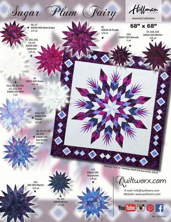 Twirl through the winter wonderland of our newest Congo Star Mixer, Sugar Plum Fairy. Inspired by the whimsy and elegance of the Nutcracker’s iconic dance, this delightful 68″ square quilt glistens with frosty blues, regal purples, and pops of festive pinks and burgundies—each color elegantly softened by a creamy field of fabrics curated from Assorted Hoffman 2025 collections. Whether you’re decking your halls or adding a touch of holiday sophistication to your seasonal décor, Sugar Plum Fairy is a beginner-friendly gem. With only straight-line piecing and no Y-seams, it’s the perfect introduction to strip piecing a lone star—the Judy Niemeyer way—offering a stress-free stitching experience ideal for newcomers ready to dance into quilting. Finished at 68″, this quilt sparkles with potential. You’ll find expansion options to grow your project, Replacement Papers if you’re craving an encore, and a full cast of notions to help your creative choreography come together seamlessly. Dress your walls, your guest bed, or your heart in a quilt that pirouettes between classic beauty and seasonal charm. Whether you’re gifting it or keeping it for your own winter wonderland, Sugar Plum Fairy is a celebration of elegance, sparkle, and joy. Expand your Quiltworx designs with ease—explore a variety of compatible border packages to expand your creations to larger sizes, all available to purchase with the pattern by clicking the Buy Now button. To expand the 68″ to an 80″ quilt, purchase one of the 281D borders. To expand the 68″ to a 99″ Queen, purchase one of the 242D borders. To expand the 68″ to a 118″ King, purchase one of the 281D borders to get you to 80″, and then purchase a 277H King On-Point border to achieve 118″. To expand your quilt to 102″, purchase one of the 281D borders to get you to 80″, and then purchase one of the 3-Tiered or 4-Tiered Adjustable borders to achieve 102″.