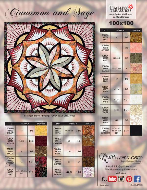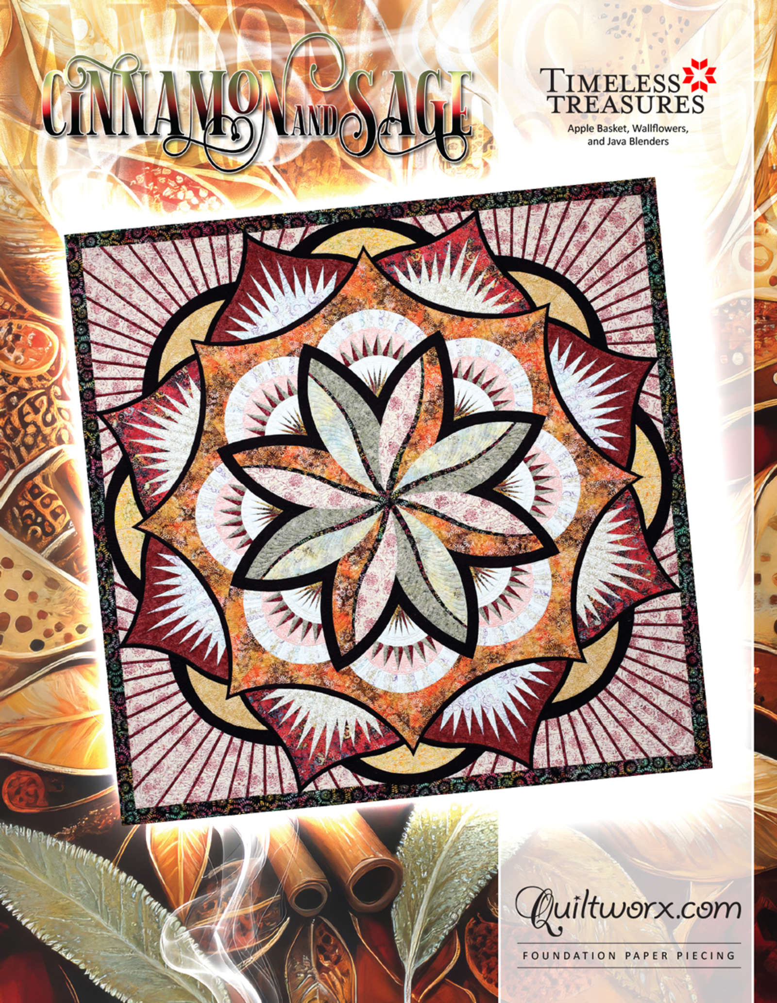 Cinnamon and Sage by Quiltworx.com is a feast for the senses—a warm, sophisticated design that blends spicy energy with soothing balance. Measuring 100" x 100", this foundation paper pieced masterpiece combines the precision of Judy Niemeyer’s signature techniques with the graceful geometry of stars, points, and curved piecing that flow together like a dance of autumn leaves. The quilt’s composition evokes the comforting tones of cinnamon and the freshness of sage—rich, earthy, and alive with texture and movement. Whether you choose traditional batiks or a modern color palette, the design sparkles with personality and rhythm. While Cinnamon and Sage is perfect for those with some paper piecing experience—it’s considered an intermediate-level project—each section builds your skills step-by-step, making it both a challenge and a joy to create. Want to go even bigger? You can easily expand your masterpiece with a 284-K border, transforming your 100" square beauty into a stunning statement piece fit for any large bed or show display at 118" square. From its elegant symmetry to its deliciously bold design, Cinnamon and Sage is more than just a quilt pattern—it’s a creative adventure that wraps you up in color, comfort, and the spirit of the season.