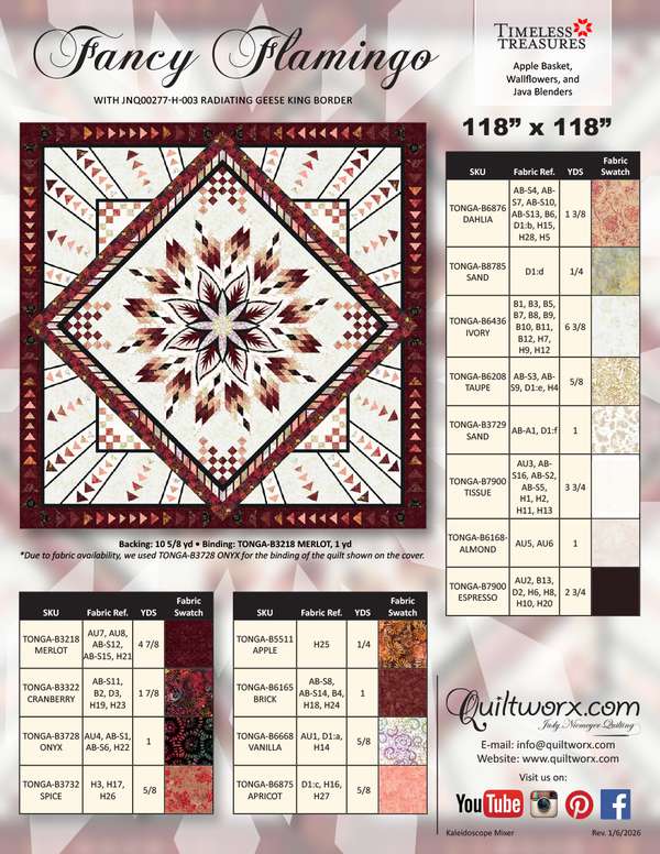 Bring a burst of tropical brilliance into your home with Fancy Flamingo, the newest addition to our Kaleidoscope Mixer series designed by Judy and Bradley Niemeyer. This lively design captures the spirit of flocks of flamingos—vibrant pinks, glowing corals, and rich reddish plumage—swirling together in a kaleidoscope of movement and color. It’s a quilt that feels like sunshine on feathers. Measuring 80″ square, Fancy Flamingo can easily spread its wings to a dramatic 118″ square with the 277-H border. This expansion layout allows you to add the King Border of your choice and play with it. We suggest the Radiating Geese Border as an option for this quilt, but any border can be selected. An layout of the original king size cover quilt is included as a template in this pattern, made from the warm, spicy palette of the Timeless Treasures Apple Basket Collection, designed by Judy and Judel Niemeyer. The stunning 118″ sample — expertly pieced by Certified Instructor Tracy Thompson of Lotus Owl Fiber Arts, LLC –shows off the pattern’s tropical elegance, and the quilting is nothing short of gorgeous. In addition to the original pattern, you will need to order the following: (1) 277-H King Border of your choice. If you do not add the border to your order, you will only receive the wall size pattern and need to order the border again. Keep an eye out for digitized quilting designs coming soon, the perfect finishing touch to make your Fancy Flamingo truly soar. If you’re ready to make a second quilt (and trust us, you might be), Replacement Papers are available. And to make your sewing experience smooth and joyful, we offer a curated selection of helpful notions–curved rulers, glue sticks, repositionable glue, rotary cutters, fold templates, purple thangs, and more. Everything you need to help this quilt come together like a dream. Fancy Flamingo is a radiant, tropical showpiece—an uplifting addition to any room and a celebration of color, movement, and the magic of Judy Niemeyer’s design.
