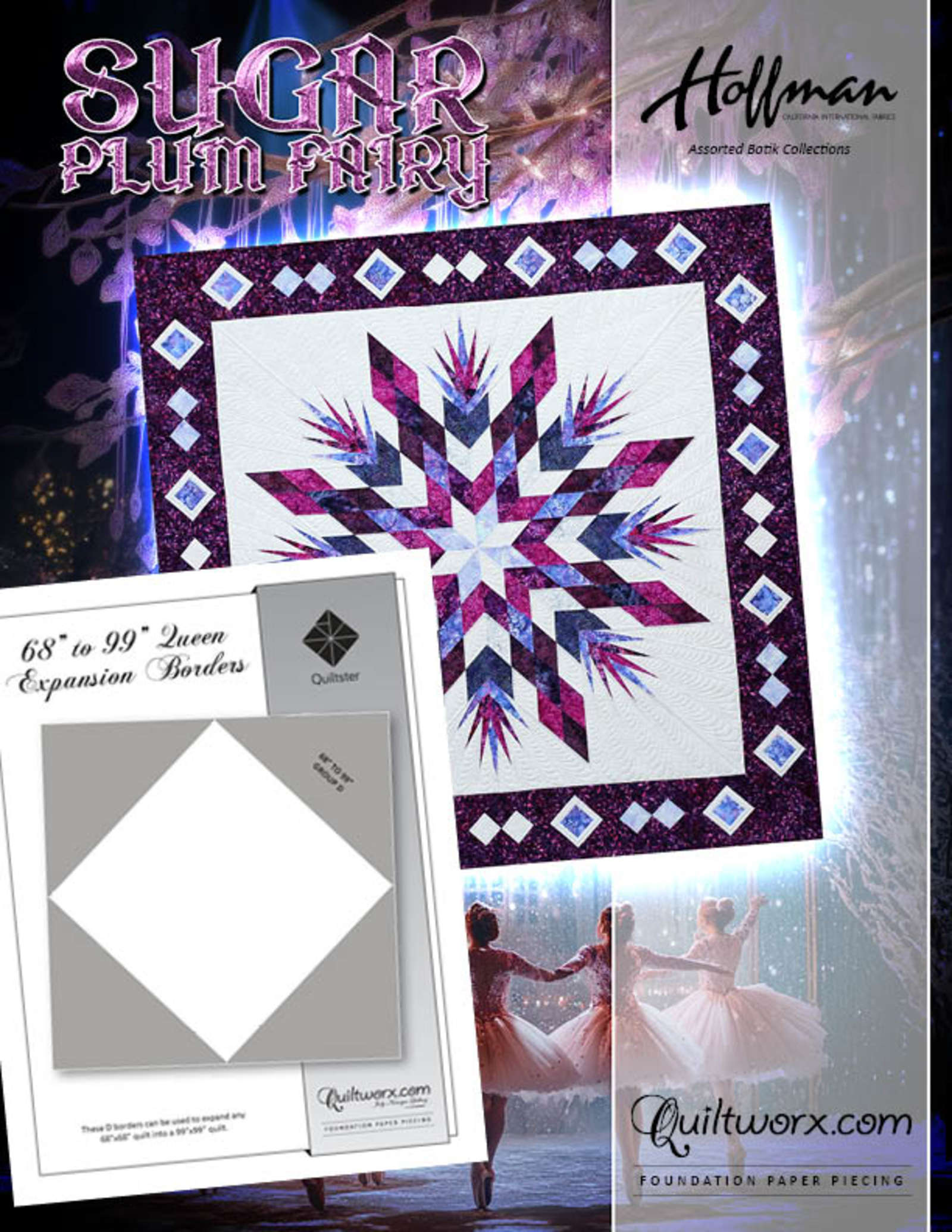 Twirl through the winter wonderland of our newest Congo Star Mixer, Sugar Plum Fairy. Inspired by the whimsy and elegance of the Nutcracker’s iconic dance, this delightful 68″ square quilt glistens with frosty blues, regal purples, and pops of festive pinks and burgundies—each color elegantly softened by a creamy field of fabrics curated from Assorted Hoffman 2025 collections. Whether you’re decking your halls or adding a touch of holiday sophistication to your seasonal décor, Sugar Plum Fairy is a beginner-friendly gem. With only straight-line piecing and no Y-seams, it’s the perfect introduction to strip piecing a lone star—the Judy Niemeyer way—offering a stress-free stitching experience ideal for newcomers ready to dance into quilting. Finished at 68″, this quilt sparkles with potential. You’ll find expansion options to grow your project, Replacement Papers if you’re craving an encore, and a full cast of notions to help your creative choreography come together seamlessly. Dress your walls, your guest bed, or your heart in a quilt that pirouettes between classic beauty and seasonal charm. Whether you’re gifting it or keeping it for your own winter wonderland, Sugar Plum Fairy is a celebration of elegance, sparkle, and joy. Expand your Quiltworx designs with ease—explore a variety of compatible border packages to expand your creations to larger sizes. This layout allows you to expand the 68″ to an 99″ quilt, by purchasing one of the 242-D borders. For other expansion options, search for Sugar Plum Fairy in the general search bar.