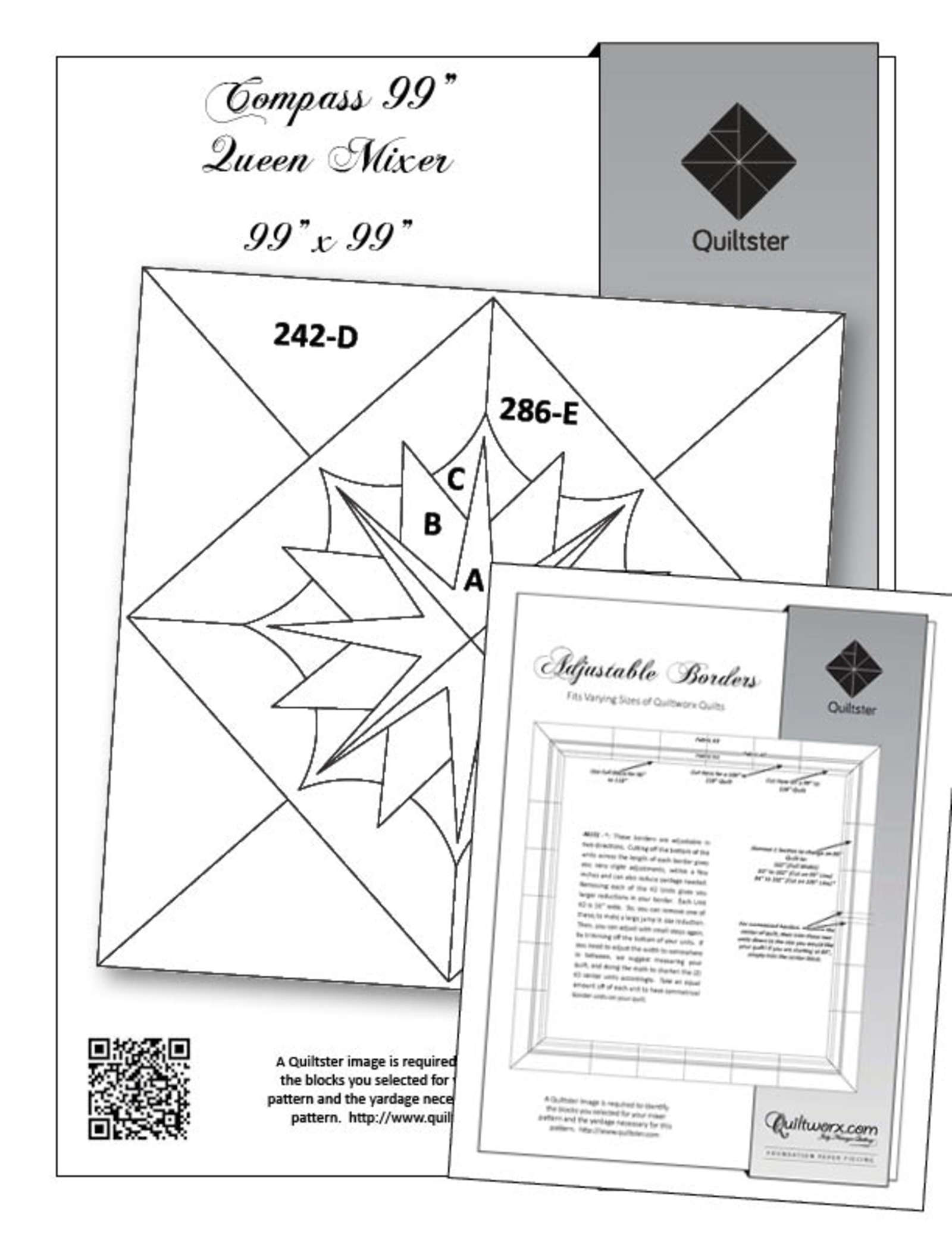 This mixer combines blocks from the Compass Mixer series to create a 118" King Quilt. The blocks required include: JNQ00286A ~ Center Compass JNQ00286B ~ Compass Star JNQ00286C ~ Sails JNQ00286E ~ 68" Border JNQ00242D ~ 68" to 99" Border JNQ00284K ~ 99" to 118" Adjustable King Border
