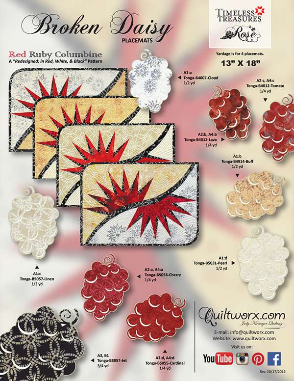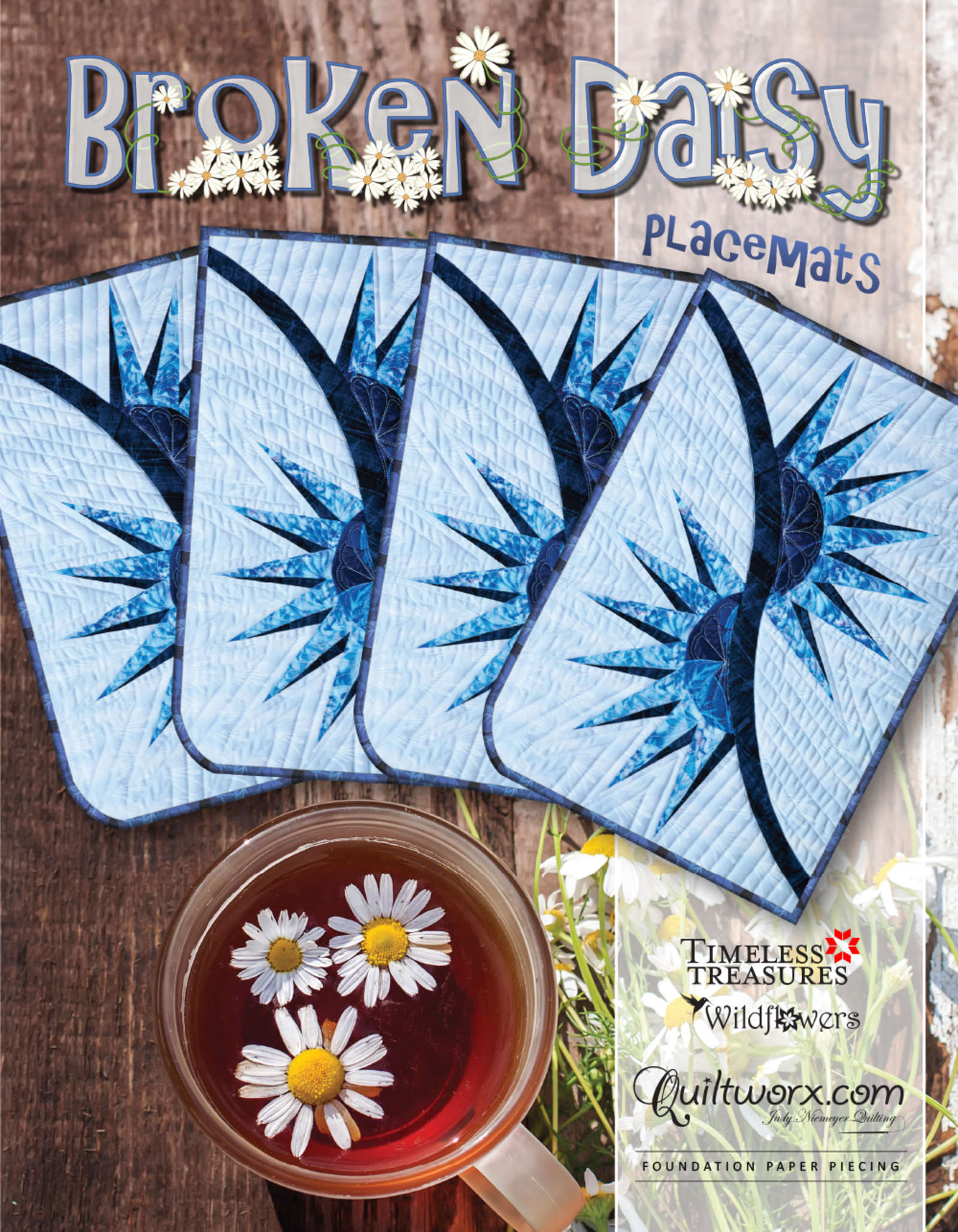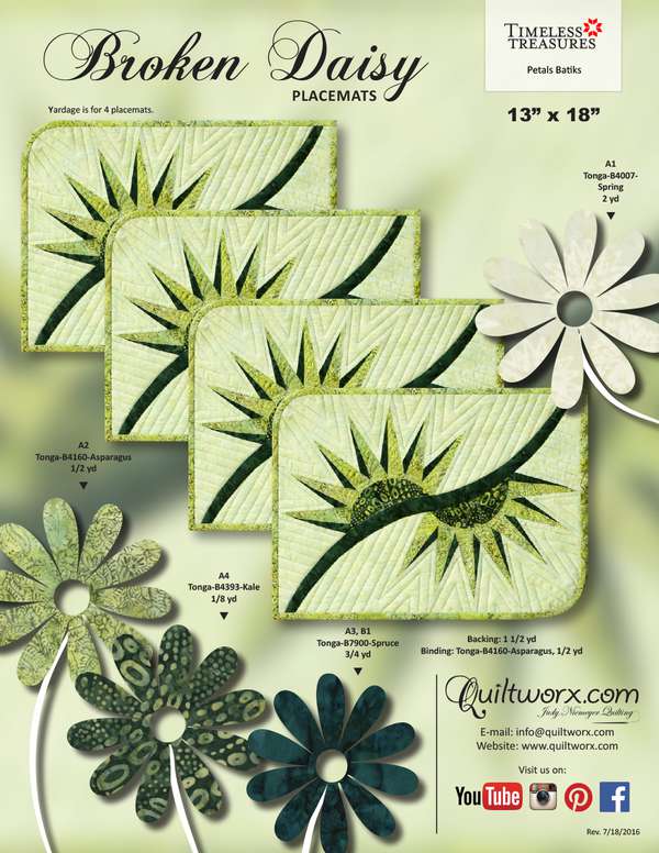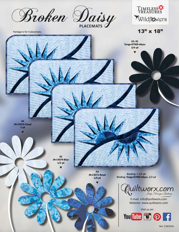 Brad and Judy Niemeyer designed the layout, instructions, and foundation papers for the Broken Daisy Placemats. A collection of fabrics designed by Judel and Judy Niemeyer with Timeless Treasures were selected to make samples shown on the cover (collections include Wildflowers and Petals). A sewing technique called foundation paper piecing is used to assemble the units required to make this quilt. Curved piecing is used to join the units after the foundation piecing is completed.