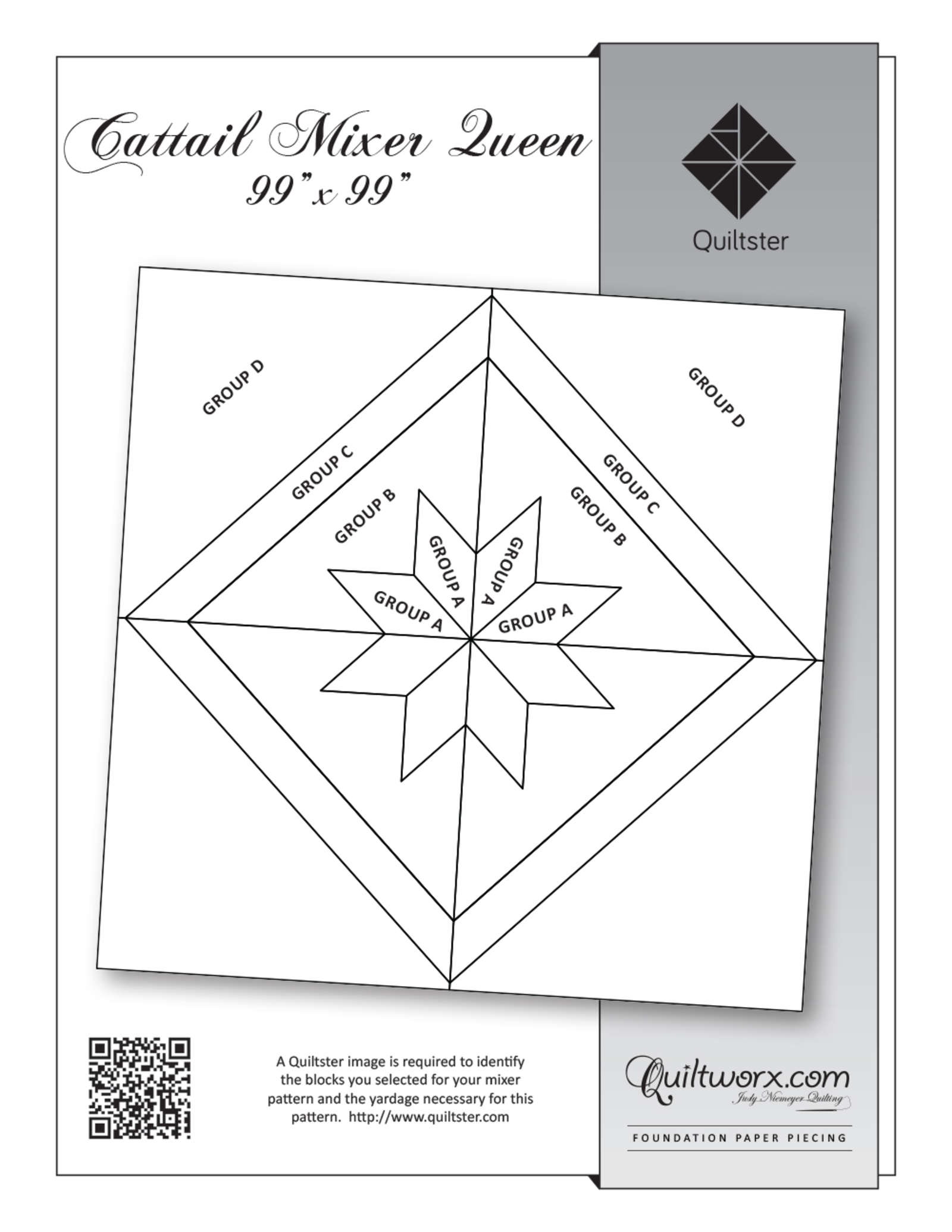 Cattail Mixer Queen finishes to 99 square inches. Mix and match predesigned block options to create your own design. Subscribe to Quiltster.com to access the Quilt Planner to try different combinations of blocks and figure out which ones you like the best. Be sure to purchase the pattern as well as the blocks you desire.