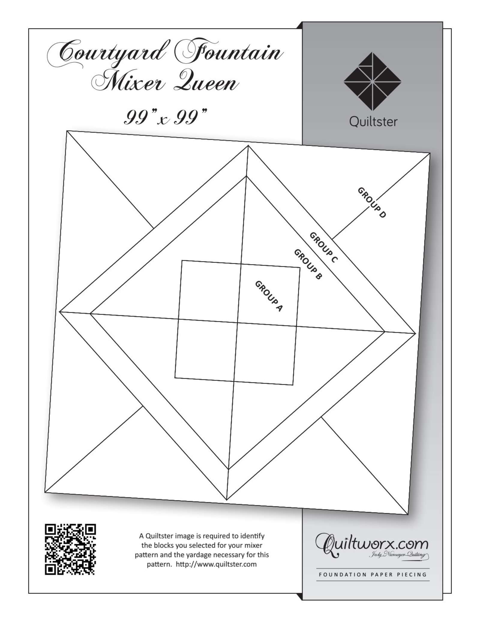 The Courtyard Fountain Mixer Queen is a Mixer Series pattern where you can choose from a variety of different foundation paper pieced blocks to create your quilt. This design has (4) different groups, a 16" Square center group, a B Border that brings the quilt to 57" square, a C Border, which increases the quilt to 68" square, then a 99" on point border, to get to the Queen size quilt.