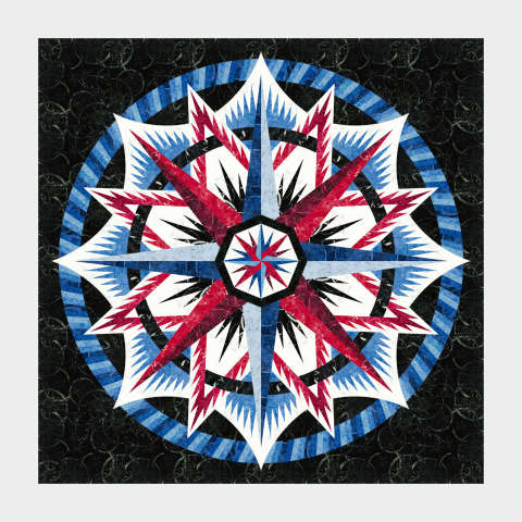 The quilt blocks were designed by Judy and Bradley Niemeyer. The layout and colorway was created by Judel Niemeyer.  The cover quilt was made and quilted by Michael Davison.  This version of the design will allow you to increase the size of your Maritime Compass from 68" to 80" in size. If you would like to expand past 80 inches, please choose the On Point Queen or On-Point King  block option instead.