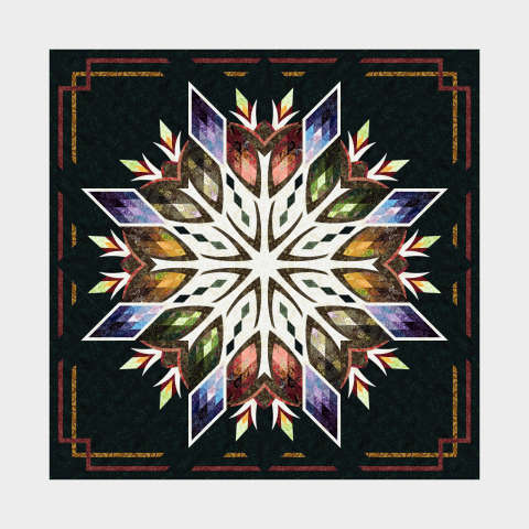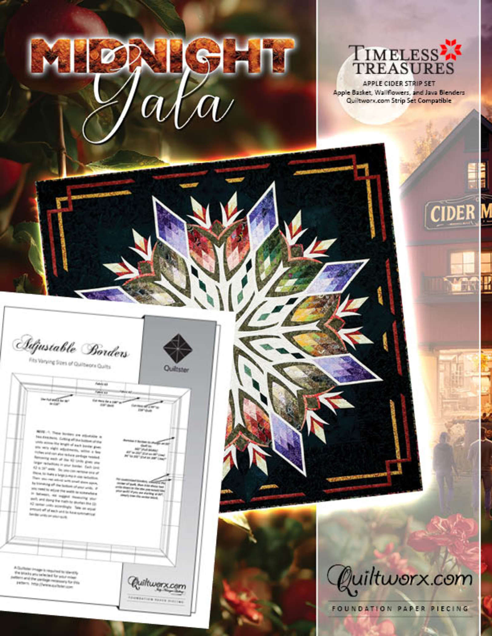 Midnight Gala is the latest release in our Kaleidoscope Mixer series, designed by Judy and Bradley Niemeyer with a colorway curated by Judel Niemeyer using Quiltster. This quilt captures the essence of autumn with a rich, spicy palette that evokes cinnamon sticks, clove pods, and steaming mugs of mulled apple cider. At its center lies a striking motif reminiscent of a sliced apple core, radiating outward in symmetrical layers that invite both admiration and introspection. Measuring 96″ x 96″, Midnight Gala offers a dramatic presence on its own, but with this pattern, it can be expanded to a luxurious 118″ by adding an Adjustable Expansion Border. To complete the expanded quilt, purchase the original pattern and the border of your choice. The cover quilt features a harmonious blend of fabrics from our Apple Cider Strip Set, Apple Basket, and Wallflowers collections—all designed by Judy and Judel Niemeyer to celebrate the textures and tones of fall. Midnight Gala is more than a quilt pattern; it’s a celebration of seasonal beauty, thoughtful design, and the joy of craftsmanship. Whether you’re drawn to its geometry, its evocative color story, or the legacy of the Niemeyer family’s artistry, this quilt is ready to become your next heirloom.