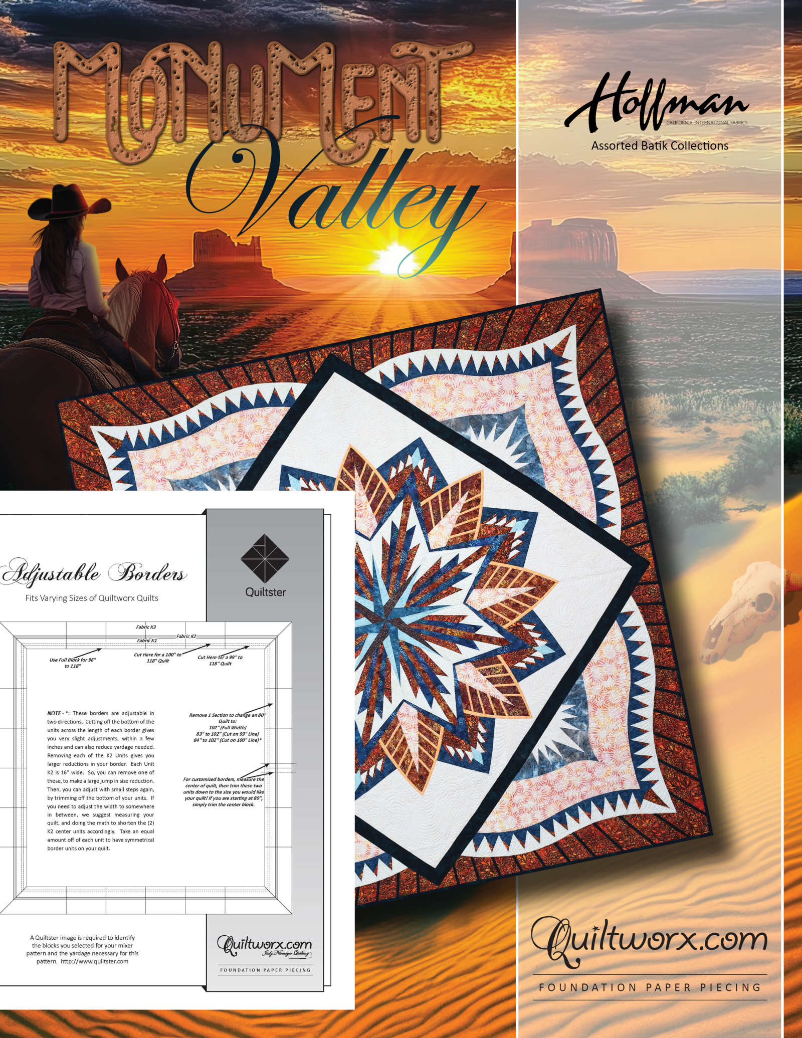 Monument Valley is a foundation paper pieced design by Quiltworx.com.  This layout allows you to add any of the 284-K Adjustable Borders to this design to take it from 99" to 118" square.  This pattern requires the purchase of the Monument Valley Design, along with the 284-K border of your choice.
