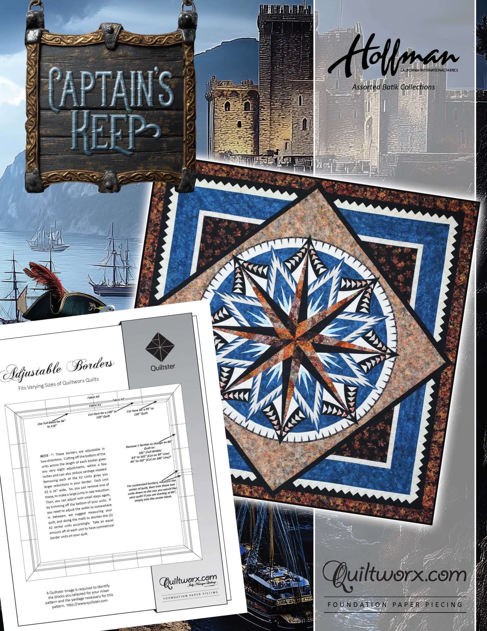 The Captain's Keep King Expansion takes the original Captain's Keep, which is 99" square to 118" square with the addition of a Quiltworx Adjustable King Border. You will need to purchase the original Captain's Keep pattern, then the adjustable border of your choice to make this layout.