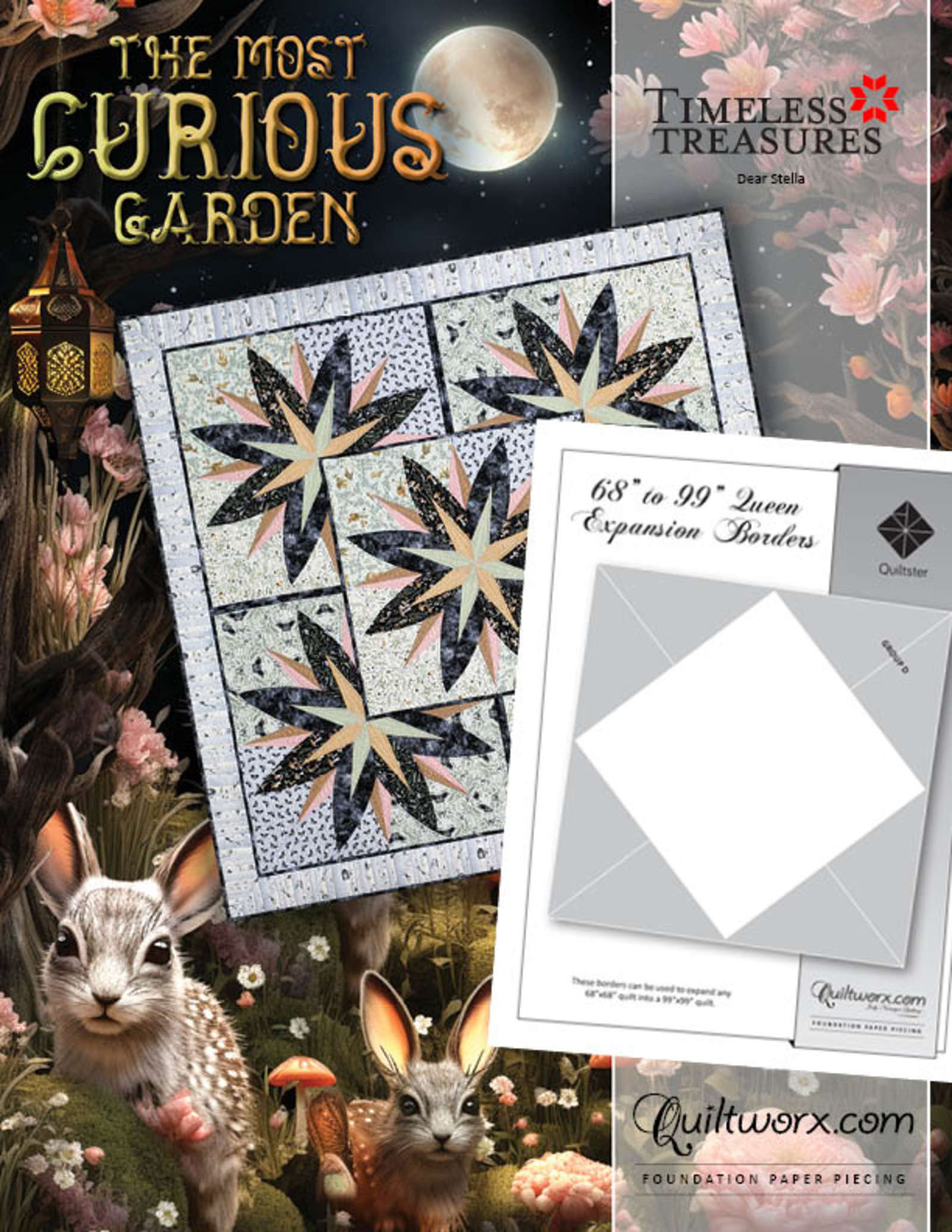 The Most Curious Garden Queen On-Point Expansion is a foundation paper pieced pattern by Quiltworx.com. This layout allows you to expand the original Most Curious Garden pattern to 99" square by choosing your favorite 242-D Queen Onpoint border. You will need to purchase the Most Curious Garden original pattern, then whichever border you chose to complete this design.