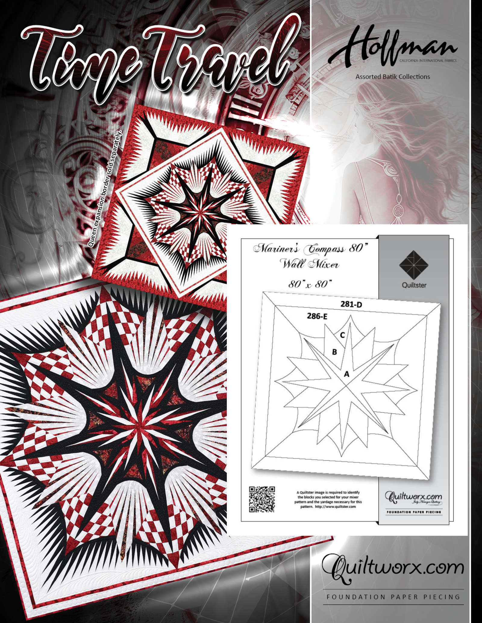 Time Travel is a foundation paper pieced pattern by Quiltworx. The original pattern finishes to 68" square. However, if you would like to increase the size to 80", and 68" x 80" border can be purchased to accomplish this objective. You can test borders and add fabrics to get updated yardage with the additional border using this pattern in Quiltster. Once you have designed your kit, purchase the original Time Travel pattern and the 68" to 80" border of your choice (281-D).